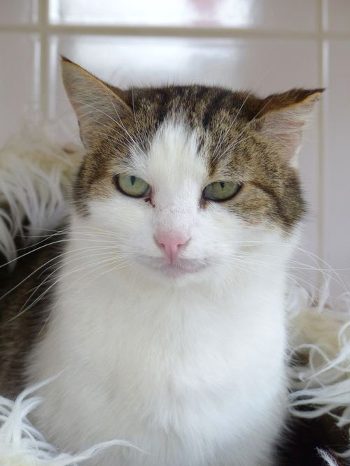 AIME tigré et blanc angora 10 ans arrivé en mars 2016, atteint d’une énorme infection résistante et d’une anémie trop sévère