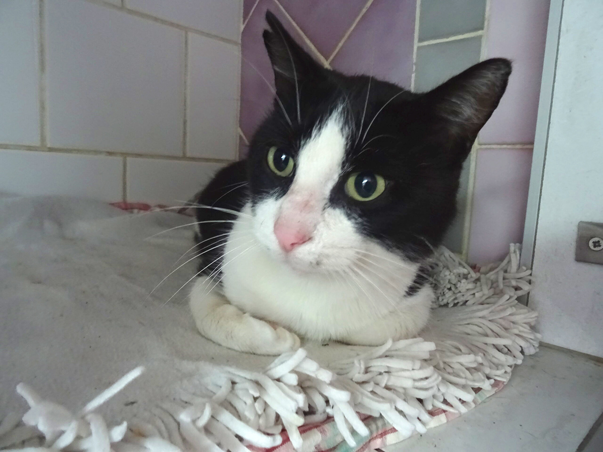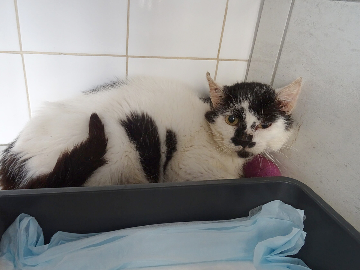 BOUNTY noire et blanche 11 ans ex chatte libre de Bezons en soins pour des brûlures importantes aux pattes