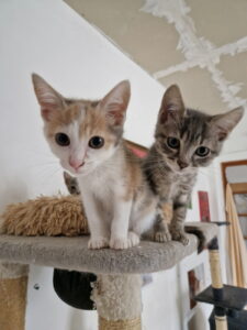 Adorable chatonne plein de vie, curieuse et joueuse. Un tout petit peu timide au premier abord, elle se décoince très vite avec le jeu, la nourriture et les câlins. C’est la tricolore de gauche