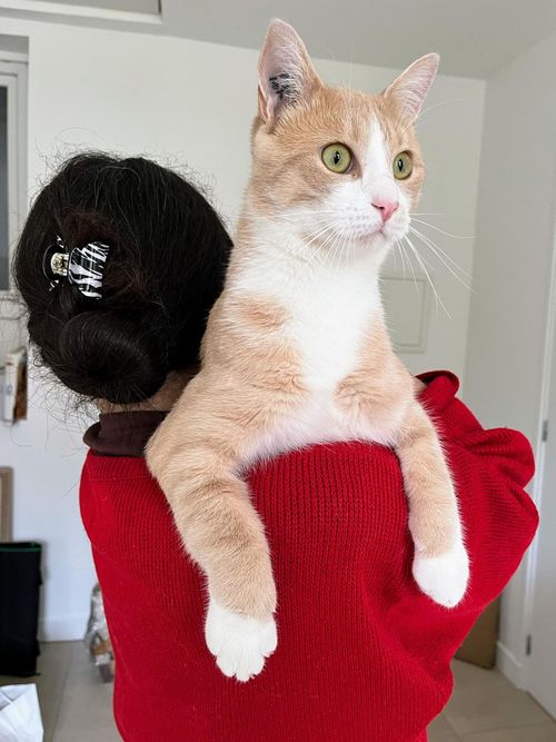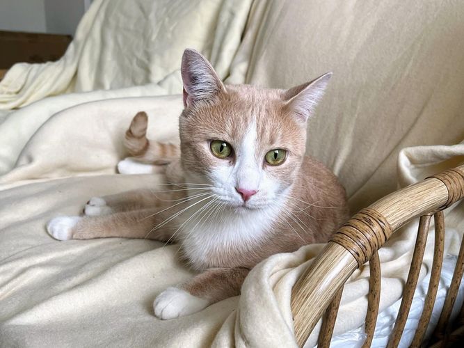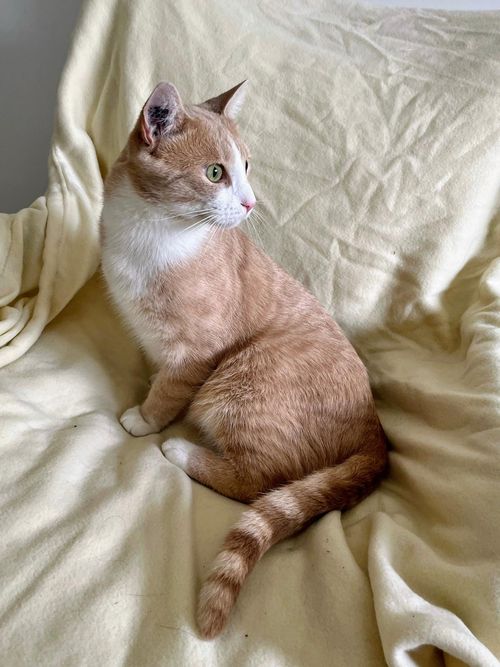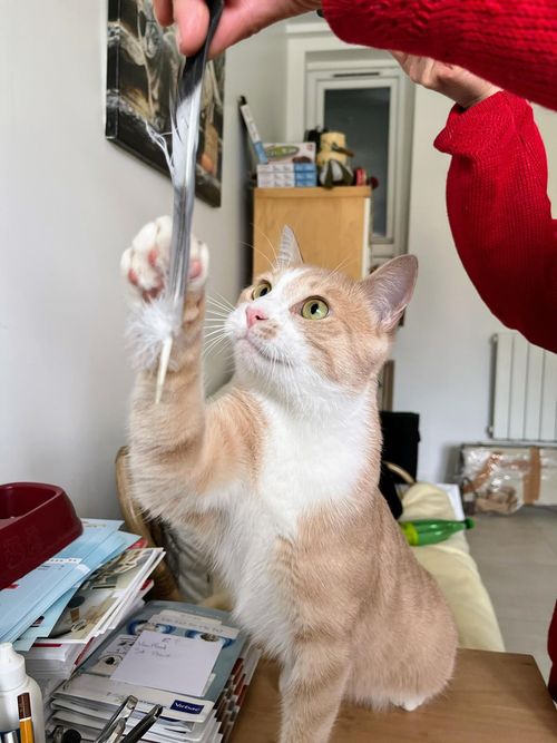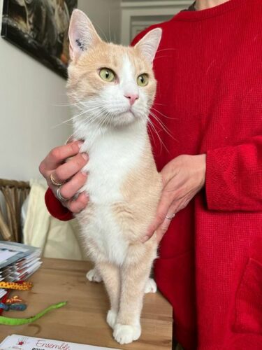 Ce jeune chat à la robe crème est à l’aise, curieux et câlin. Gourmand aussi, il ne résiste pas au bruit du sachet.