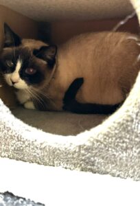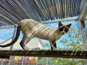 Axena est très belle avec ses yeux couleur azur. Elle fait l’admiration des visiteurs, mais toujours de loin. C’est une grande joueuse et elle surveille le jouet pour l’attraper quand c’est le moment. Elle passe alors dans la catégorie des chats à parrainer en juin 2023.