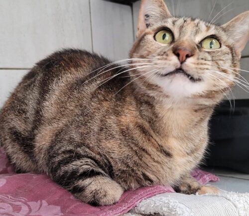C’est une très jolie minette tigrée à la tête toute ronde et le petit museau blanc.