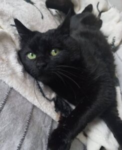 C’est un magnifique chat noir à la bonne bouille toute ronde et des plumets au bout des oreilles. Son poil est tout doux et brillant