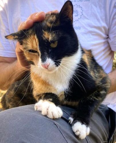 C’est une superbe chatounette tricolore demi-face noire et rousse !