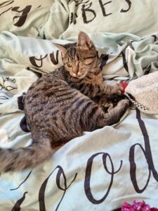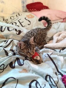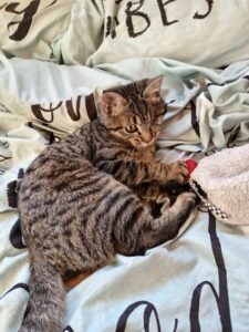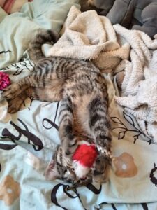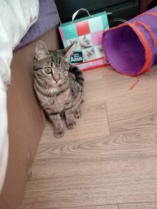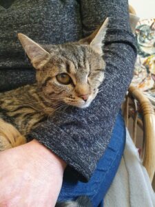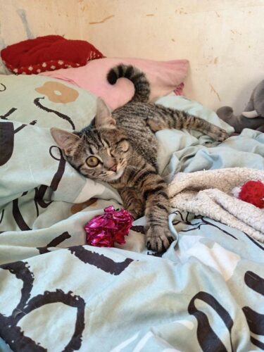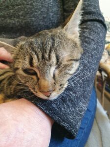 Ils ont été soignés par notre ophtalmo spécialisé. Glover est aujourd’hui guérie. Elle a dû être énucléée d’un œil mais ça ne l’empêche pas d’être une grande chatonne joyeuse, joueuse et câline.