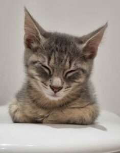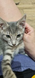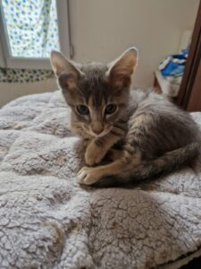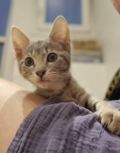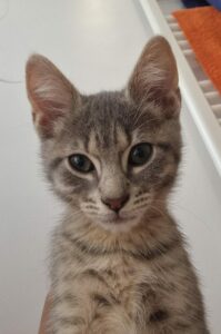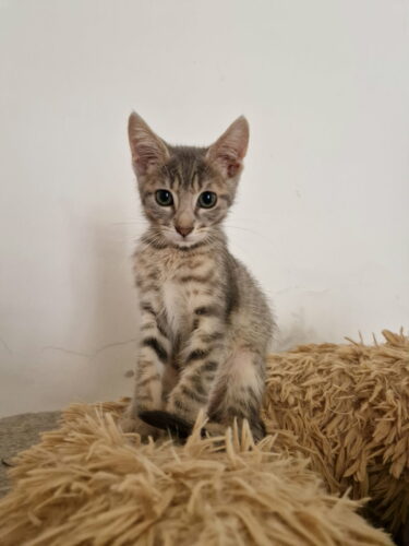 Adorable chaton plein de vie, curieux et joueur. Un tout petit peu timide au premier abord, il se décoince très vite avec le jeu, la nourriture et les câlins.