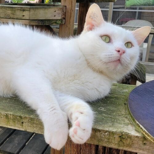 Majesty est un chat blanc au pelage est doux et soyeux. Ses yeux verts lumineux captivent instantanément. Il a une allure élégante et gracieuse.