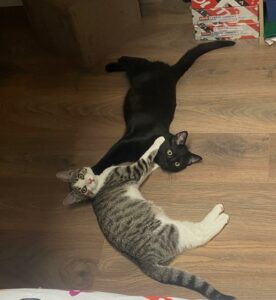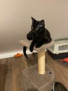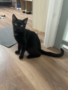 C’est un grand chaton très gentil, plus timide que sa sœur, on évitera les jeunes enfants mais OK grands ados respectueux.