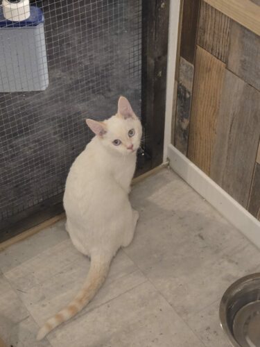 C’est un adorable chaton blanc avec oreilles rousses et queue tigrée rousse.