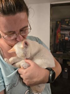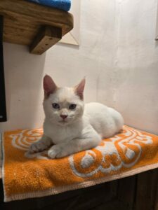 C’est un adorable chaton blanc avec oreilles rousses et queue tigrée rousse.
