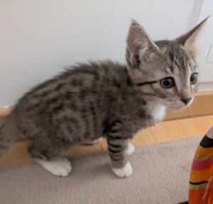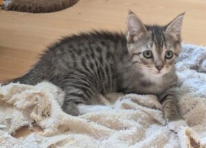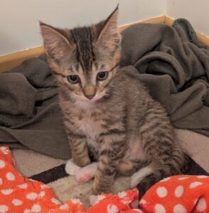 Mouchette arrive de Montigny. Elle a été trouvée avec sa maman, Meringue, et sa fratrie.