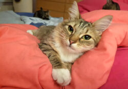 Élégante Adopté ! Naissance : Février 2022 Sexe : Femelle Poils : Mi-longs Couleur : Tigré marron et blanc✔ Stérilisé✔ Identifié✔ VaccinéTesté FIV ➖, FeLV ➖- Pas d'enfants en bas âge