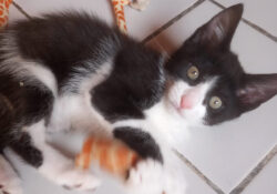 - Couleur : Tigré marron et blanc