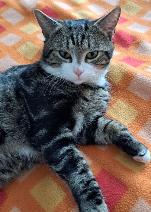 Craintif au départ mais sa confiance se gagne rapidement. Il aime offrir son petit bidon pour avoir des câlins. Il n’hésite pas a se mettre à vos pieds pour les avoir.